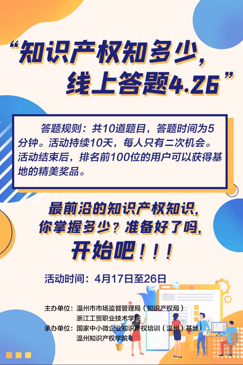 4月17日-26日,国家中小微企业知识产权培训(温州)基地、温州知识产权学院充分发挥新媒体平台优势,在全市范围内开展知识产权有奖竞猜线上活动。为了更好地普及知识产权相关知识,本次竞猜涵盖知识产权基本知识、知识产权的保护与运用、地理标志、商标、专利、版权等方面的知识,并以随机单选题和多选题组合的形式呈现。活动吸引了近3000余名市民群众参加,多位答题者交出满分答卷,成绩喜人。经过10天的激烈角逐,最终产生了100位获奖者。