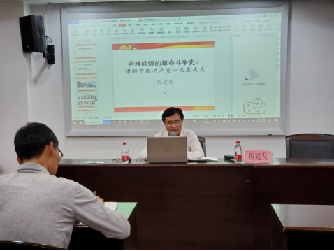 在党课授课中,倪建发副书记带领全体党员回顾了中国共产党一大至七大召开是时间、地点、会议重要内容以及在中国发展历程中的重要意义,详细讲解了自中国共产党第一次全国代表大会以来,随着中国共产党的发展壮大、任务转变及不断成熟,中共中央领导机构的不断调整、变革过程。倪副书记用真实有趣的人物小故事、幽默风趣的生动语言带领大家走进那时那刻的场景,获得了在场师生党员阵阵的掌声。