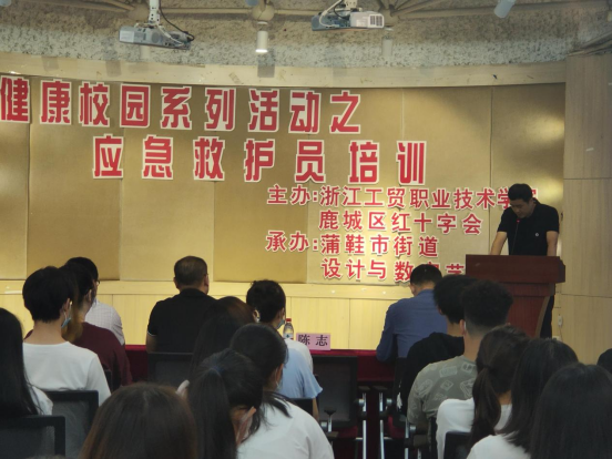 “为庆祝中国共产党成立100周年,进一步践行党对教育事业的全面领导,加强学校健康教育,推进健康校园建设,深化学校管理育人、环境育人、文化育人、劳动育人的育人体系”,2021年6月5日上午8:30在多功能厅由设计与数字艺术学院和总务处共同开展应急救护员培训。参加活动的有来自鹿城区红十字会的陈志会长、黄秀茶老师、彭华华老师,设计与数字艺术学院的副书记张云帆、总务处余正锋副处长、总务处陈贤敏副处长以及设计学院的120余名学生一起参加培训。
