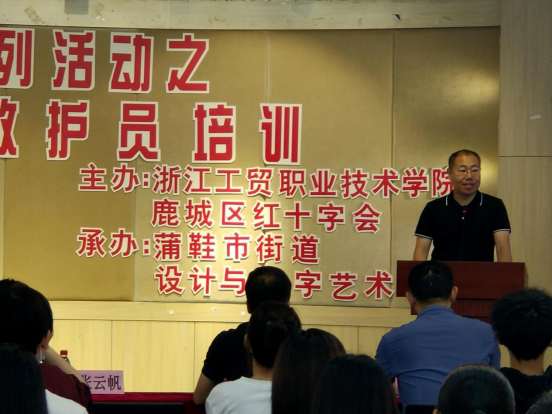 培训活动由余正锋副处长主持。设计与数字艺术学院张云帆副书记、鹿城区红十字会陈志会长分别做了动员讲话。张老师首先对参与本次培训的指导老师表达谢意,他建议同学们一是要保持严肃的学习态度,认真学习,认真训练,把急救培训当做战略核武器,一旦遇到严重突发事件,我们可以从专业的角度来救治。陈会长对工贸学子学习急救知识、健康知识和救援技能,支持红十字工作的行为表示肯定。陈会长表示,多年实践证明,在学校开展红十字工作对加强学生健康教育、思想教育等有非常重要的意义。
