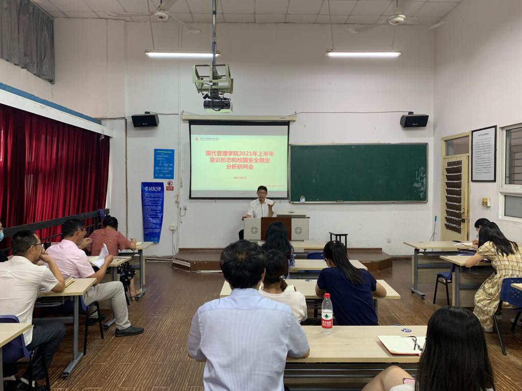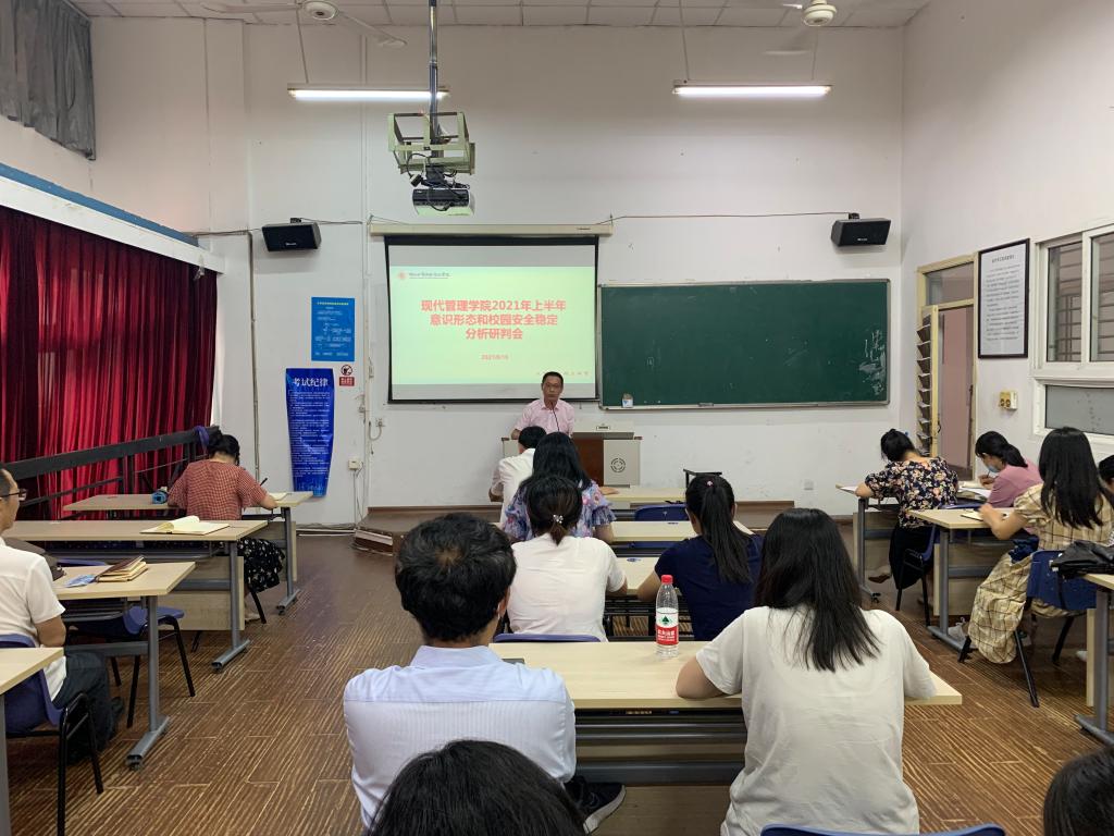 为了贯彻落实意识形态工作责任制,维护校园安全稳定,2021年6月16日,现代管理学院在府东路校区5208教室召开2021年上半年意识形态和校园安全稳定工作分析研判会,现代管理学院党政班子成员、全体行政人员和2019级、2020级全体班主任参加会议,会议由现代管理学院党总支副书记朱秀清老师主持。