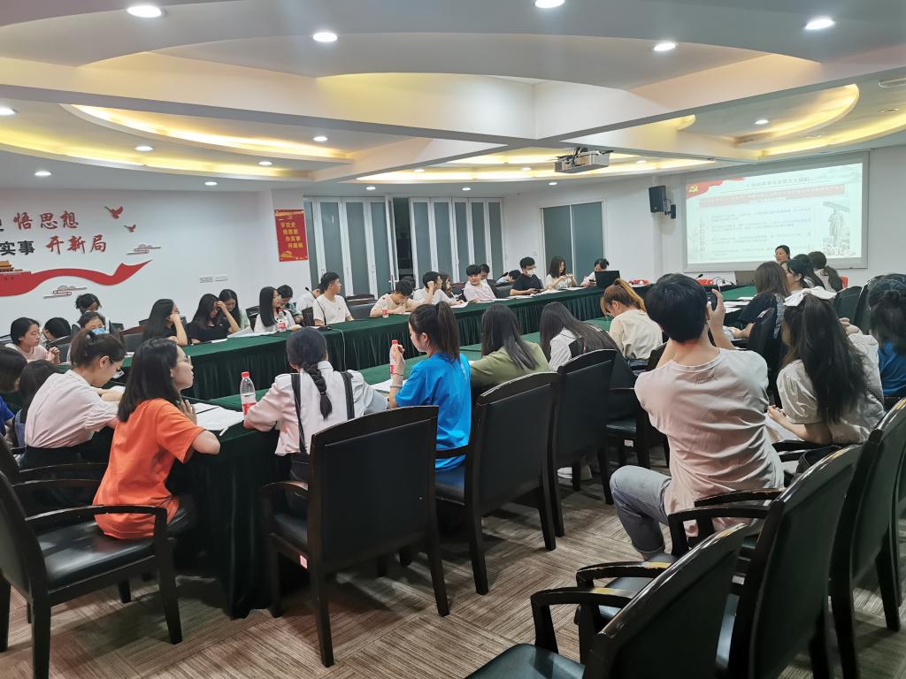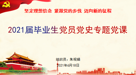铭记百年党史,砥砺奋进前行,为庆祝建党100周年,坚定毕业生党员理想信念,现代管理学院学生党支部于2021年6月18日下午16点在府东路校区风投院三楼会议室开展了题为《坚定理想信念 紧跟党的步伐 迈向新的征程》的党员专题党课,党课由现代管理学院组织员朱观娟老师主讲,现代管理学院学生党支部全体毕业生党员参加。