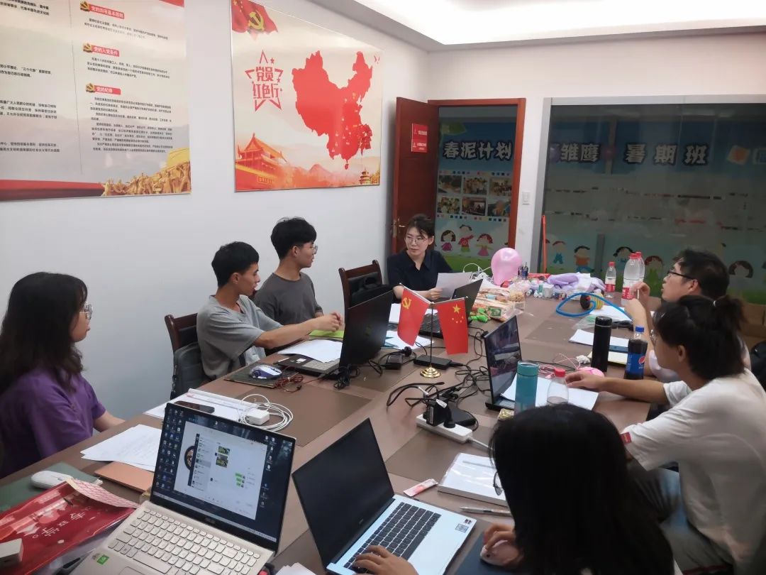 7月4日晚上,在开班之前。由鲍怡蒙老师组织支教小队在永固集团会议室召开开班前的全体队员部署会议。在会议上,各位队员复盘自己的分工,在座的其他队员仔细聆听并提出细节上存在的问题,在会上共同讨论解决。最后由爱心支教小队的队长项陈恩同学梳理并强调开班仪式的流程和注意事项,确保开班仪式和接下来的支教活动可以顺利开展。