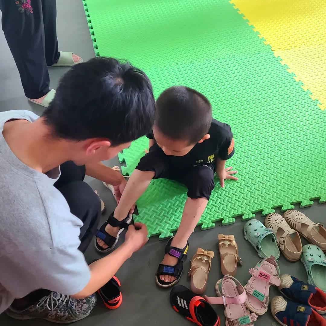 2.幼儿班室内铺了地垫,小朋友们进门需要脱鞋,出门需要穿鞋。每天二十几名小朋友无数次进出教室,都是爱心支教小队的队员们不厌其烦的蹲在地上为小朋友们穿鞋脱鞋,并引导小朋友们将自己的鞋子放在特定位置上。