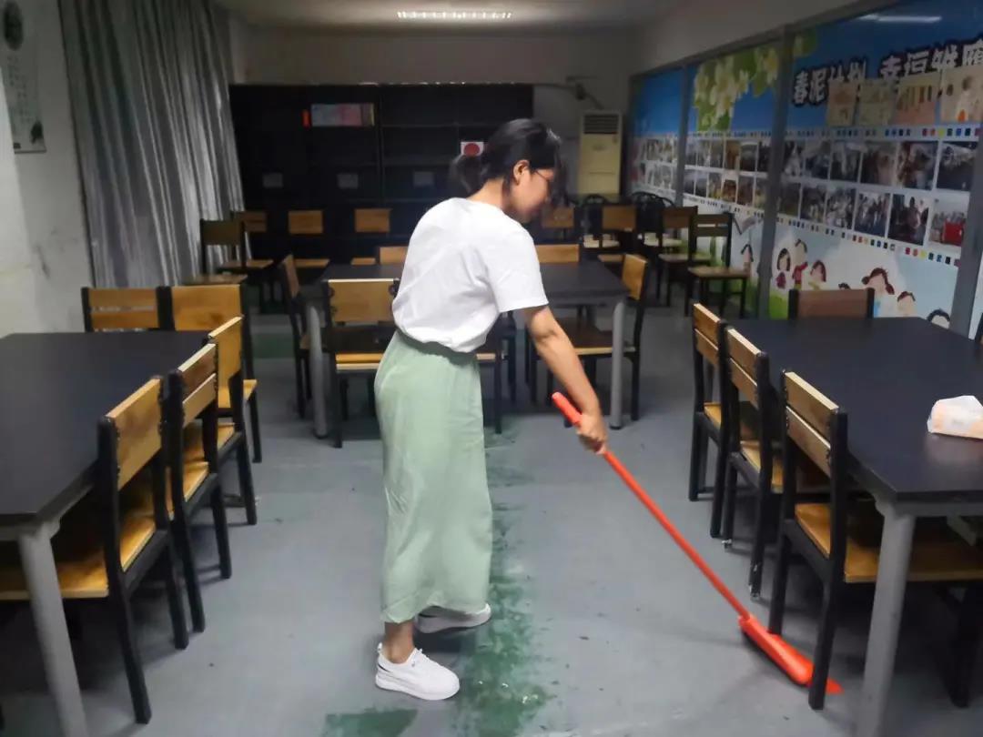 结束了辛苦的每日教学后,对于队员们来说,比休息更重要的是打扫教室以及活动场地并整理好第二天小朋友们要用的午睡凉席和被褥。
