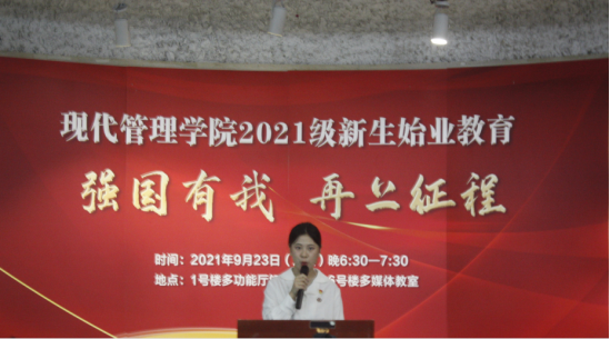2021年9月23日晚上6点30分,现代管理学院在府东路校区一号教学楼二楼多功能厅开展以“强国有我·再上征程”为主题的2021级新生开学第一课,第一课会议以“线上+线下”形式开展,1200余位2021级新生及班主任在教室集中观看直播。现代管理学院党政班子成员、教师代表孙仁峰、辅导员及2021级学生代表在主会场参加。大会由现代管理学院党总支副书记朱秀清主持。