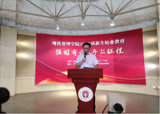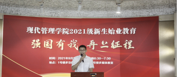 最后,现代管理学院党总支书记项光春老师做新生寄语。项老师说,2021年是中国共产党成立100周年,是全面建成小康社会,开启建设社会主义现代化国家新征程的开局之年,习近平总书记在庆祝中国共产党成立100周年大会上指出,“一百年前,一群新青年高举马克思主义思想火炬,在风雨如晦的中国苦苦探寻民族复兴的前途。一百年来,在中国共产党的旗帜下,一代代中国青年把青春奋斗融入党和人民事业,成为实现中华民族伟大复兴的先锋力量,习近平总书记勉励新时代的中国青年要以实现中华民族伟大复兴为己任,增强做中国人的志气、骨气、底气,不负时代,不负韶华,不负党和人民的殷切期望”。项老师希望全体同学通过增长知识、锤炼品格,以真才实学服务人民,以创新创造贡献国家,以实际行动践行“强国有我”的青春承诺。