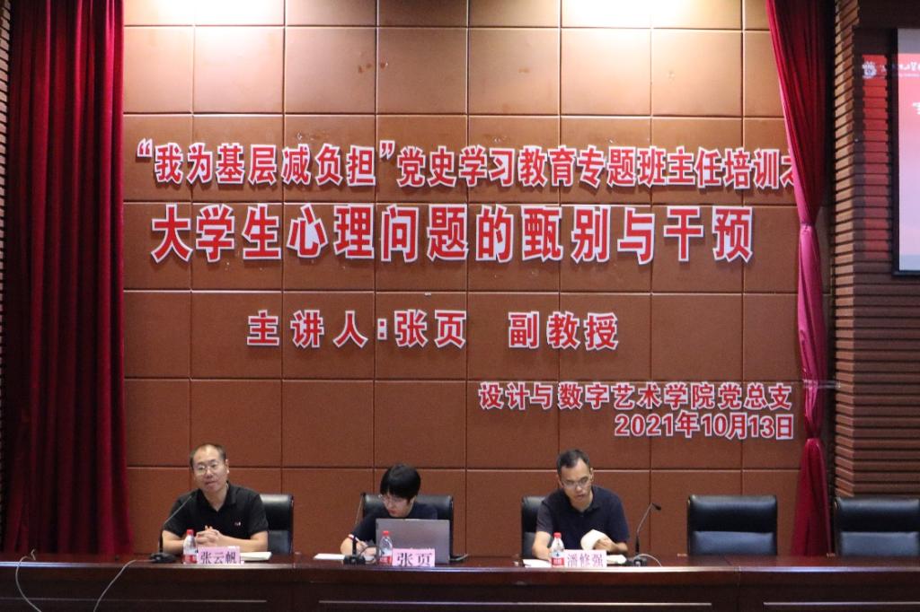 为进一步加强班主任对大学生常见心理问题的识别,了解大学生群体心理疾病特点,并帮助班主任加强处置对策工作,设计与数字艺术学院党总支开展“我为基层减负担”党史学习教育专题班主任培训系列活动之“大学生心理问题的甄别与干预”。讲座邀请到学校心理咨询中心张页副教授主讲,设计与数字艺术学院党总支书记潘修强、副书记张云帆出席讲座,设计与数字艺术学院全体辅导员、班主任参加了讲座。