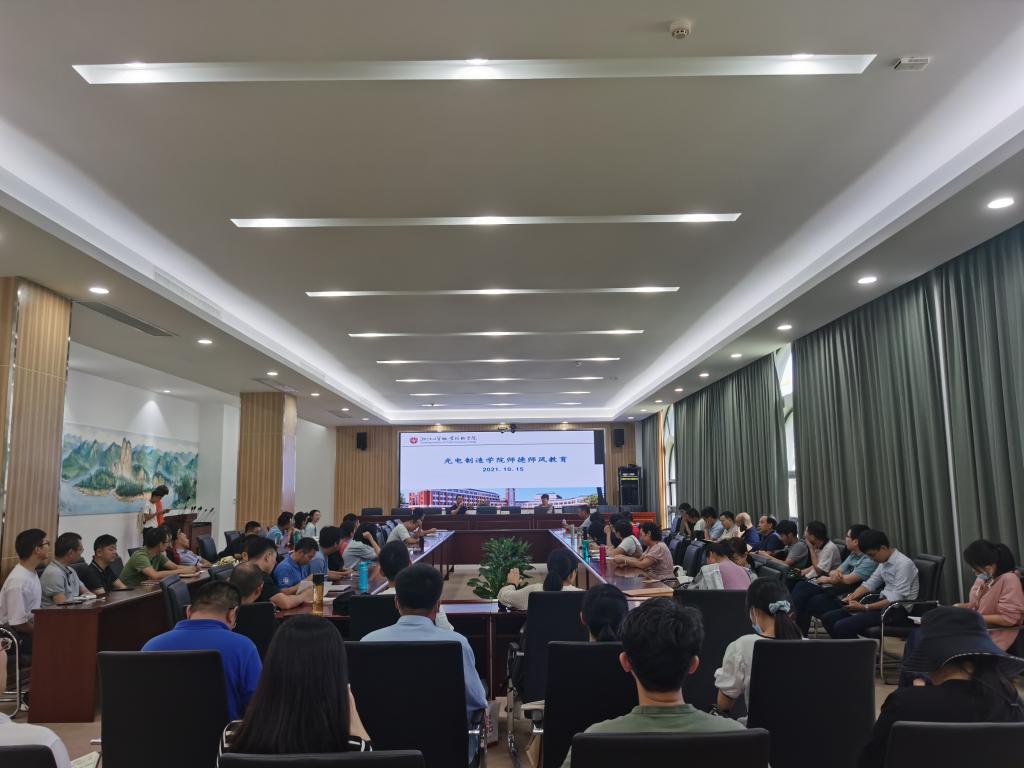 为深入学习贯彻习近平总书记关于师德师风的重要论述,把师德师风建设摆在首要位置,引导广大教师继承发扬老一辈教育工作者“捧着一颗心来,不带半根草去”的精神,牢记为党育人、为国育才使命。10月15日下午,光电制造学院师德师风教育讲座在行政楼104会议室举行,特邀全国优秀教师国际商贸学院院长成荣芬老师主讲,全体教师参加,会议由张勰书记主持。