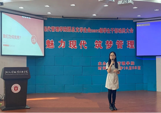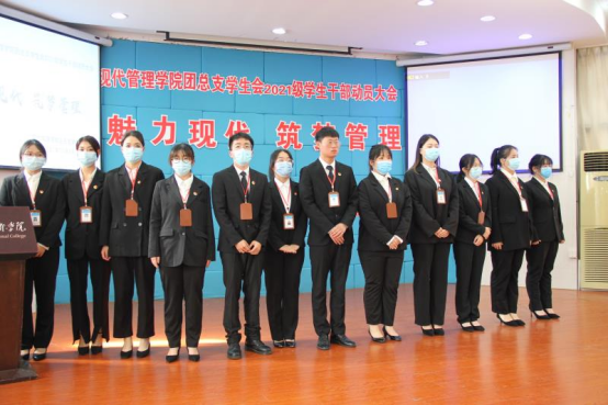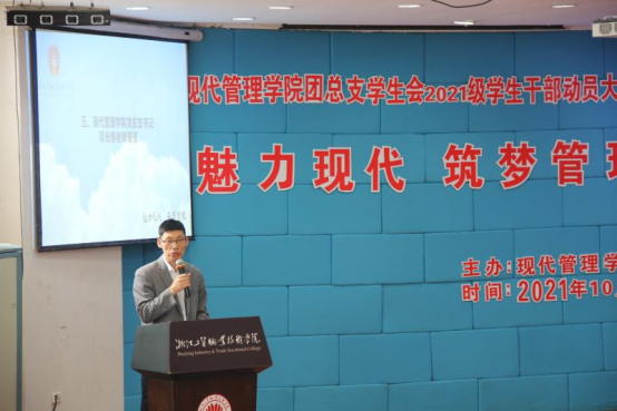 为了欢迎2021级新干事和团学工作的顺利进行,现代管理学院于2021年10月28日中午开展了以“魅力现代,筑梦管理”为主题的学生干部动员大会。出席本次活动的有现代管理学院党总支书记项光春老师,现代管理学院团总支书记贾飞祥老师,黄丹华老师、组织员朱观娟老师、辅导员谢戴海老师、辅导员季焕磊老师以及2020届执行主席团、部长候选人和大一全体新干事共同参加本次大会。