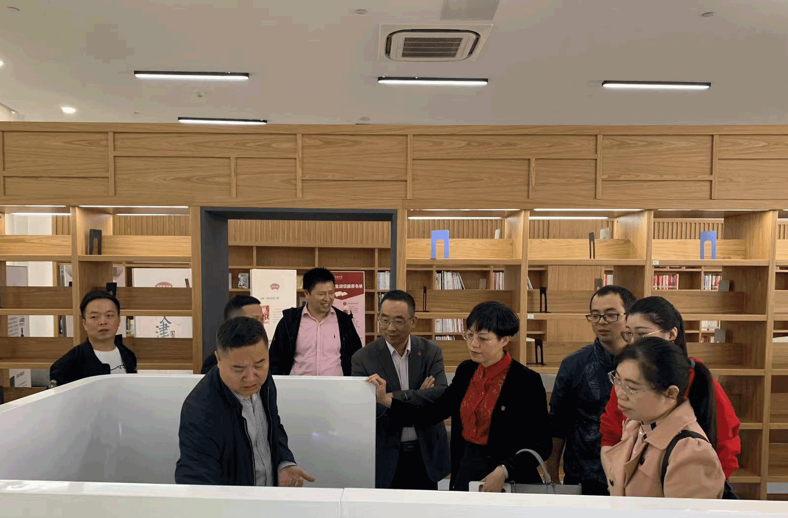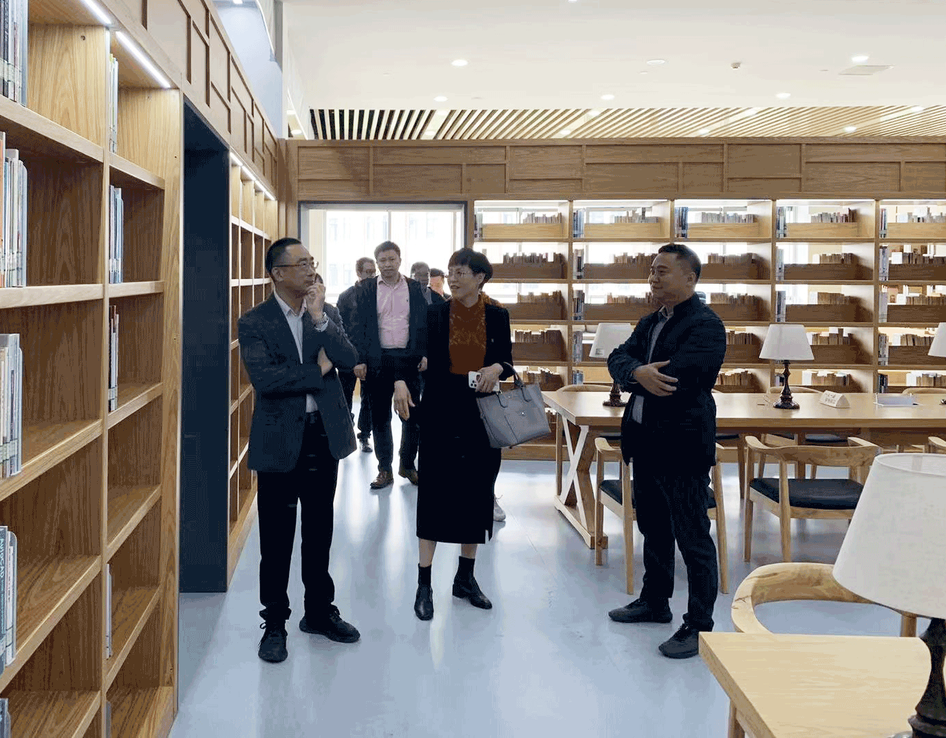 来宾们先行参观了我校智慧教室,然后进入我校图书馆进行交流活动。来宾们仔细、深入参观了我馆,对我馆特色鲜明的空间建设产生了浓厚兴趣并给予高度评价,随后在图书馆五楼会议室与我馆成员就图书馆空间建设、馆内流通管理、智慧图书馆建设等主题进行了深入探讨和交流。