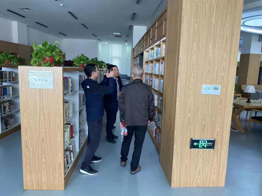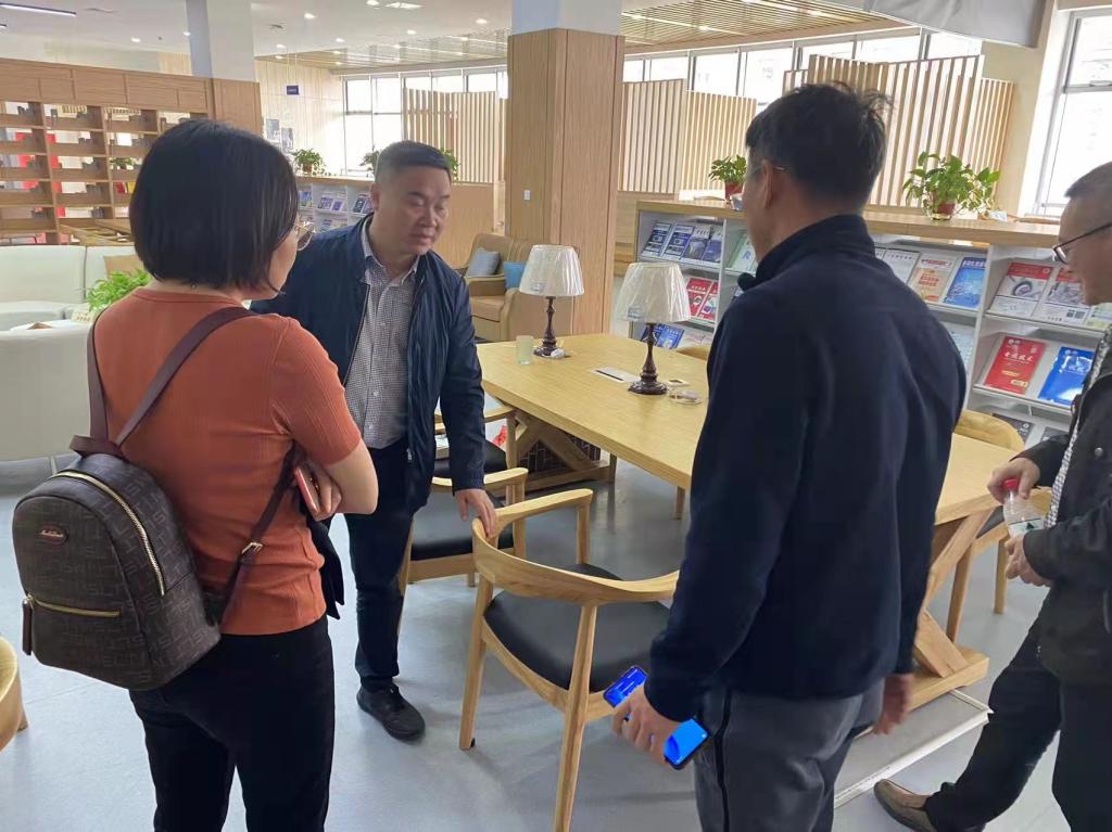 来宾们参观了我馆,尤其对馆内书架和家具的设计、工艺、材料、采购等情况进行了深入探讨和交流。刘呤书记对我馆“静、净、雅、慧”建设理念给予了充分肯定,对我馆极具书香特色又不失现代时尚气息的书架和图书馆家具赞口不绝,对书架、家具的参数设置、招标、质量把握进行了详细的调研。罗坚主任就刘书记提出的问题均一一做了解答。