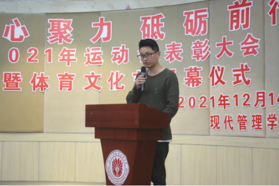 在2021年秋季运动会上,现代管理学院全体师生勇往直前、斩获佳绩。为了表彰优秀运动员和启动体育文化节,现代管理学院于2021年12月14日晚上在多功能厅举行2021年运动会表彰大会暨体育文化节开幕仪式。出席本次大会的有现代管理学院党总支副书记朱秀清、辅导员季焕磊和黄丹华以及本次运动会中获奖的运动员们。分院其他学生以钉钉直播方式参与观看。