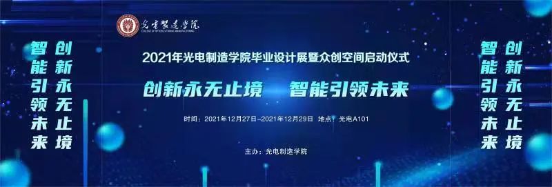 光电制造学院毕业设计展展出时间为2021年12月27日-2021年12月29日,地点为瓯江口校区光电制造学院众创空间(光电A101)。
