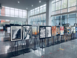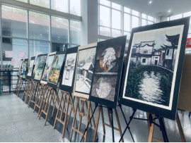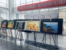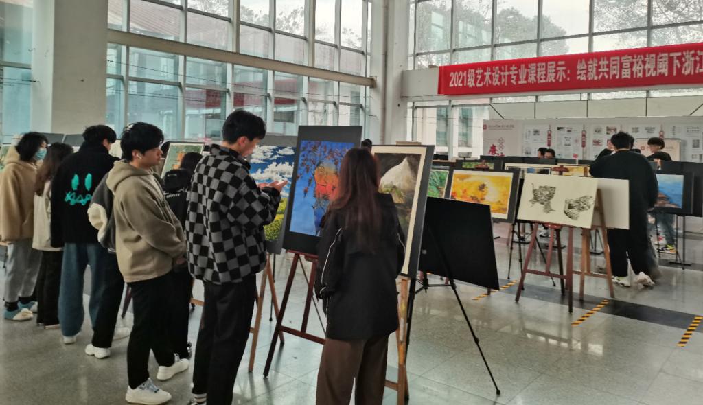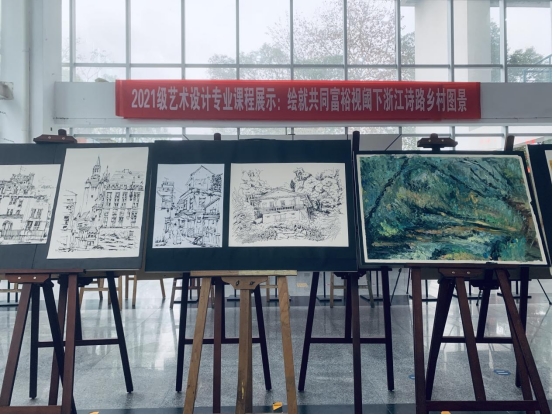 2021年12月25日,设计与数字艺术学院艺术设计专业于府东路校区六号教学楼大厅布展,展览截至2022年1月3日。本次布展以艺术设计专业教师浙江省哲社项目《浙江诗路文化带传统村落空间叙事文本研究》阶段性成果为导向,经过专业教师共同探索,将科研成果转化为教学资源,以课堂教学为载体,以绘画表现为媒介,指导21级艺术设计专业学生将乡村风景入画,融合专业技法,形成“共同富裕视阈下浙江诗路乡村图景”展览,从而提升学生美学修养。