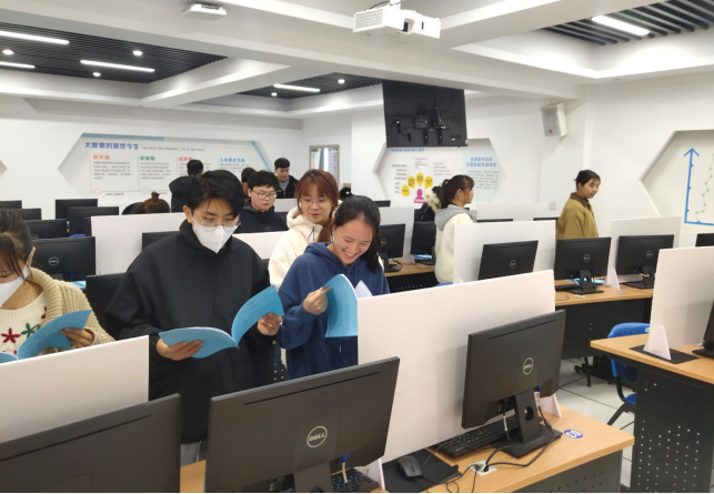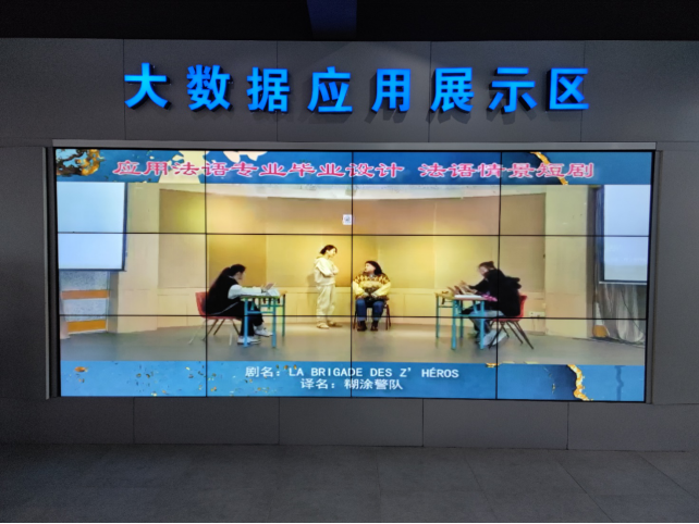 跨境贸易专业群展厅设在3507B实训室,参展专业包括国际经济与贸易、商务英语、应用法语等。去年相比,专业群本届毕业设计新增了英语口语视频、法语短句表演等类型的作品。