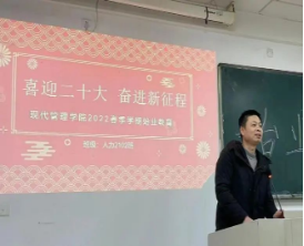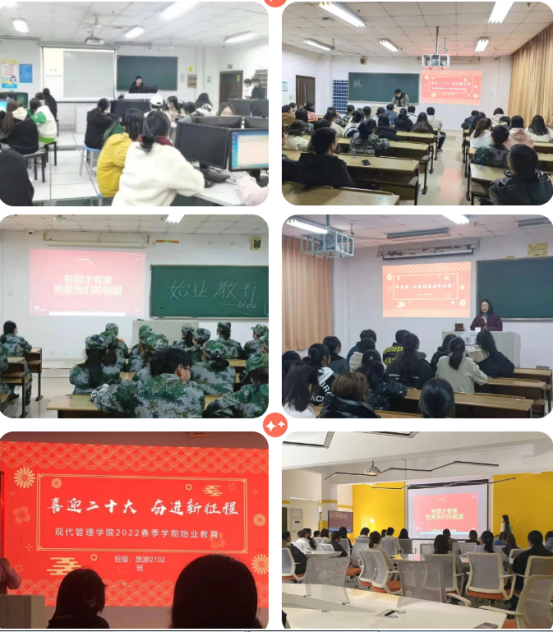 红色传承在我心,今将迈入新征程。在疫情防控工作要求下,2022年春季学期,现代管理学院改变传统的始业教育方式,采用“分院统一始业教育课件”和“各班融入班级实际情况”方式开展。2022年2月20日-3月4日,各年级各班级以线下方式陆续开展以“喜迎二十大,奋进新征程”为主题的2022年春季学期始业教育。