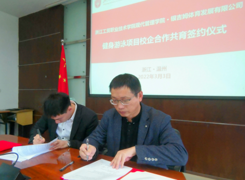 为践行现代管理学院“双高”建设,深挖温州特色资源开展校企合作,践行岗位、课程和证书紧密结合的多渠道育人理念,积极拓展校企合作共育课程开发。历经7个月相互了解和沟通,2022年3月3日现代管理学院体育运营与管理专业与温州银吉姆体育发展有限公司就开展游泳共育课程进行了现场洽谈,共同建设游泳课程签约仪式在浙工贸府东路校校区达成。参会人员有银吉姆体育有限公司浙江省区域总监王琼、温州区域运营经理邢治军;现代管理学院院长王国银,体育运营与管理专业主任任建华及专业教师。