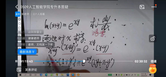 郭培俊教授在数学方面建树颇丰,专升本辅导教学经验丰富,近年来指导参加的数学建模大赛多次获省一、省二奖项,教学水平和教学风格深受学生欢迎。郭老师从考情入手,分析了延期考试与专升本的关系,消除了同学们因延期而对考题难度增大的怀疑,给同学们的复习生活吃了定心丸。随后,郭老师进行了题型与分值分布讲解,为同学们如何在最后十天分配时间重心进行了规划----把时间花在刀刃上。紧接着,郭老师对同学们的共性问题进行了具体分析,如极限的典型例题。对线上线下考生提出的问题均耐心细致地解答,而在线上会场了,同学们也积极留言互动。