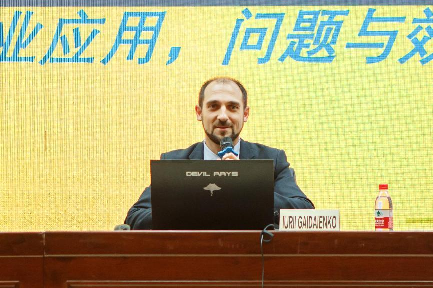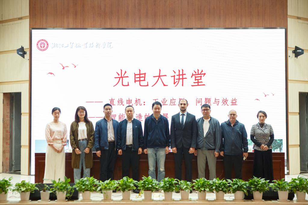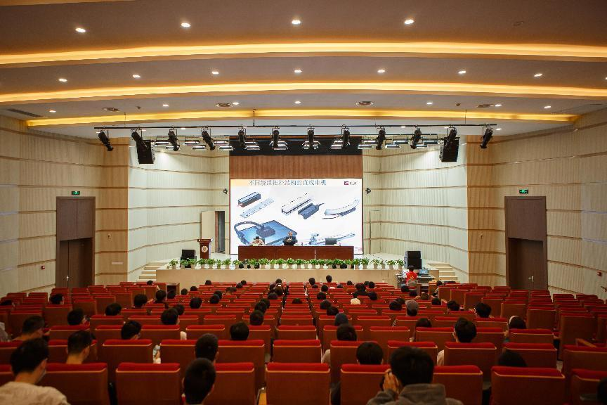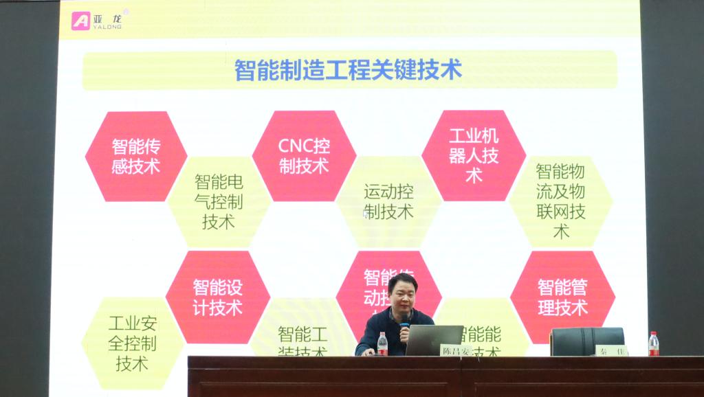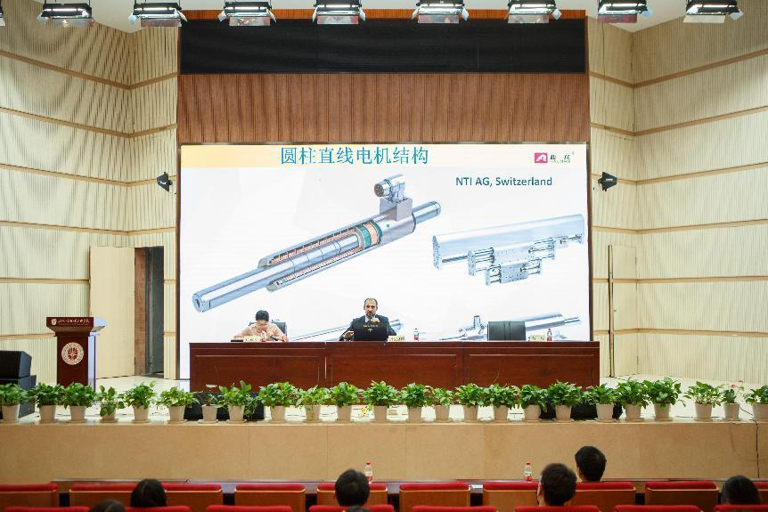 第二场讲堂,由外籍专家——乌克兰国家科学院电动力学研究所、亚龙智能装备集团有限公司高级研究科学家优瑞博士开展讲座。他讲述了学术兴趣和成就,亚龙教育技术的研发及其主要合作伙伴。重点讲解了直线电机,包活无铁芯电机和有铁芯电机类型的模组。详细介绍了其工业应用范围、问题与效益,并从亚龙YL-335B型自动生产线实训考核装备出发带领师生现场教学与探讨。