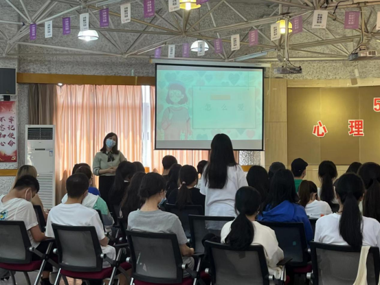 接着黄老师通过“我是谁”这个问题,让到场的每个学生定位“我是谁”。通过回答来重新认知自身,明白自己是怎么样的人,未来想要成为什么样的人,并且总结到无论自己是一个怎样的人,都愿意接纳自己。第三部分为“我爱谁”,黄老师与同学们探讨爱的对象并提到要“爱我全部的自己”、“爱我身边的朋友”“爱我的亲人”和“爱关注和关爱他人”。最后是“怎么爱”自己的环节,在与同学们讨论后,提出可以整理自己、照顾身体、接纳缺点、积极情绪、多加赞美等方法来爱自己,告诉同学们如何给予正向积极暗示。