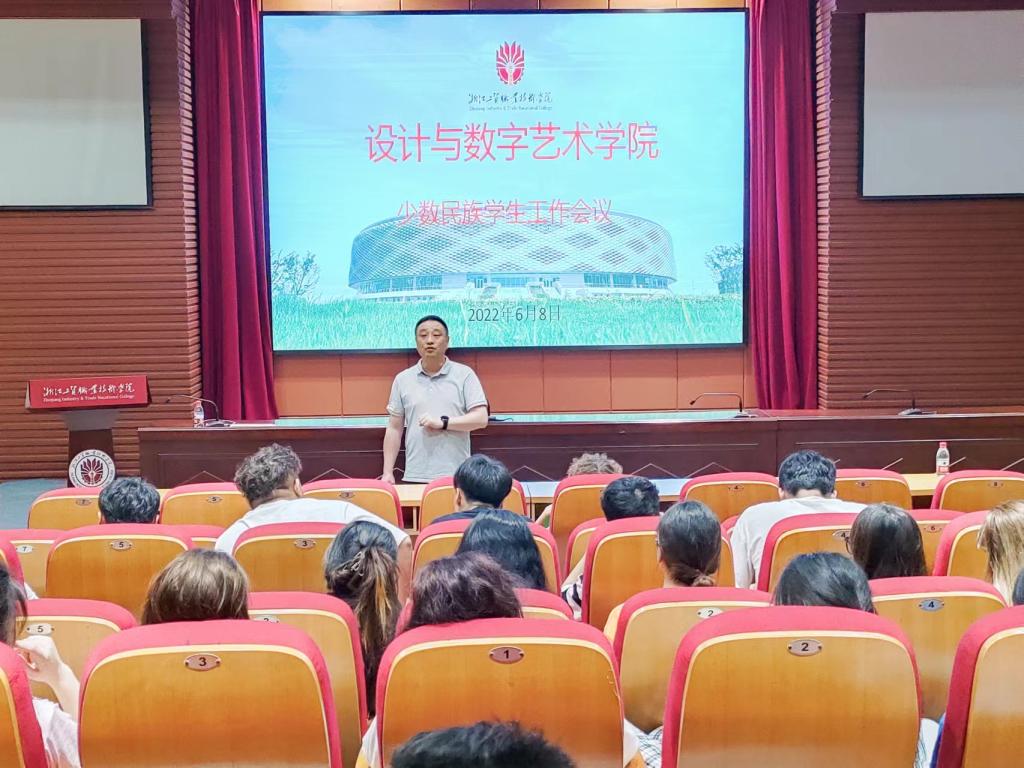 2022年6月8日,设计与数字艺术学院在学校学术报告厅召开少数民族学生工作会议,学校保卫处郑杰老师、新疆内派教师李君、学生辅导员陈剑、学院在校七十余名新疆籍少数民族学生参加了会议。