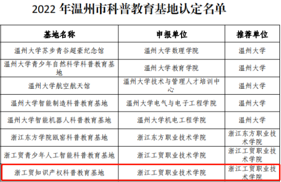 近日,温州市科学技术协会公布了2022年温州市科普教育基地名单,浙工贸现代管理学院知识产权科普教育基地成功入选温州市科普教育基地。