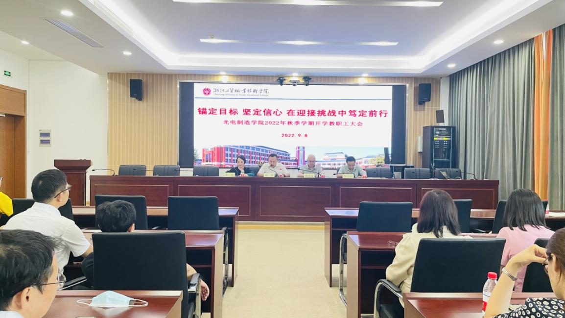 2022年9月8日下午,在瓯江口校区行政楼104会议室,光电制造学院召开秋季学期开学全体教职工大会,总结成绩,分析形势,部署新学期的重点工作,会议由学院党总支副书记秦佳主持。