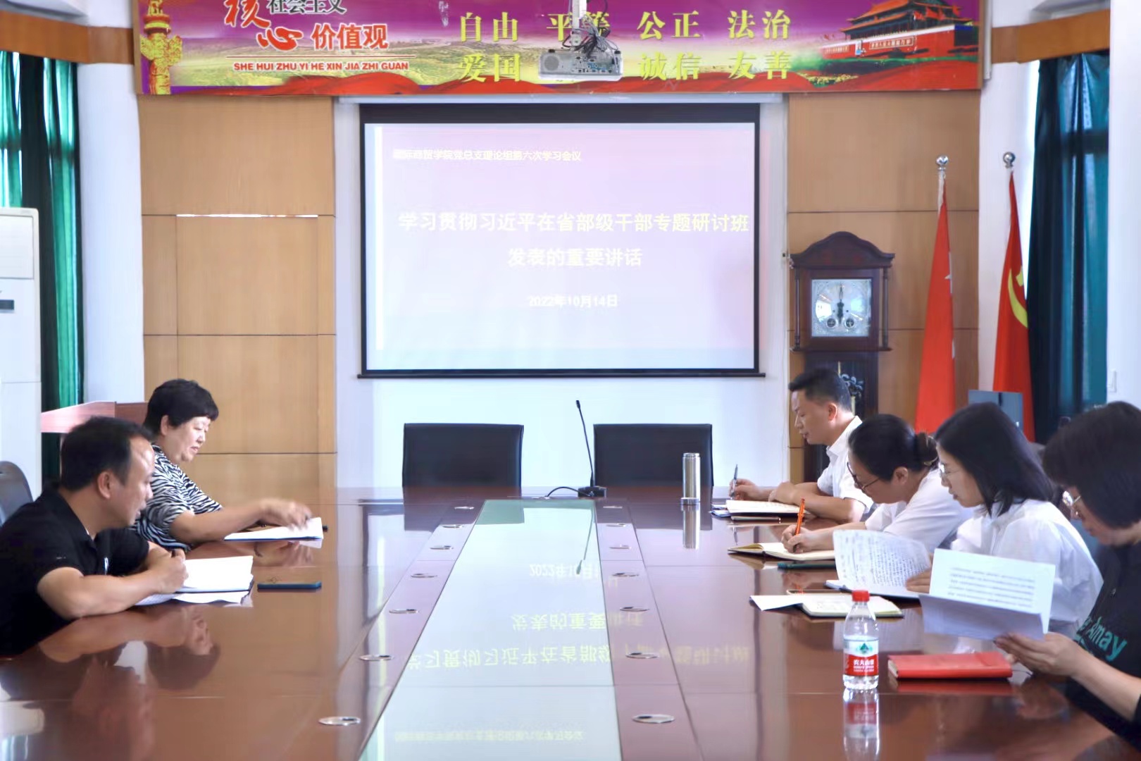 10月14日下午,国际商贸学院党总支理论中心组召开第六次学习会议,学习贯彻习近平在省部级主要领导干部专题研讨班上的重要讲话精神和《中国共产党第十九届中央委员会第七次全体会议公报》。会议由党总支书记王耀贵主持,理论学习中心组成员参加。