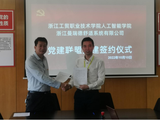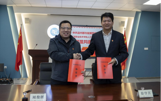 温州都市报经济新闻中心支部书记、主任周俊朗,副主任朱斌朱斌、财经事业部总监邹丽丹,记者林舒菡;浙江曼瑞德舒适系统有限公司支部书记、总经理陈章程,制造副总、工会主席叶旭强,采购部经理、党务工作者余斯斯;人工智能学院组织员姜集苗,辅导员翁昭昱,团总支书记张赛举等参加活动。仪式由人工智能学院党总支书记徐登喜主持。