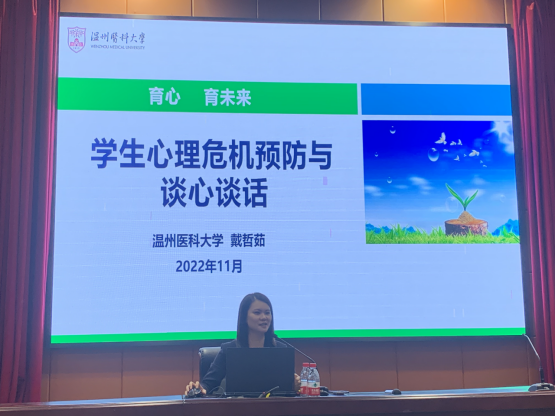 为切实贯彻党的二十大精神,强化学院教职工队伍心理育人实践能力,全面提升我院心理健康教育工作管理水平,守护学生心灵健康。11月16日下午,技师与继续教育学院在六号教学楼学术报告厅召开第12次教职工政治理论与业务知识学习会。本次学习会围绕“学生心理危机预防与谈心谈话”主题,由温州医科大学心理健康中心戴哲茹老师主讲。学院党总支副书记俞通海主持会议,全体教职工和各班心理委员参会。