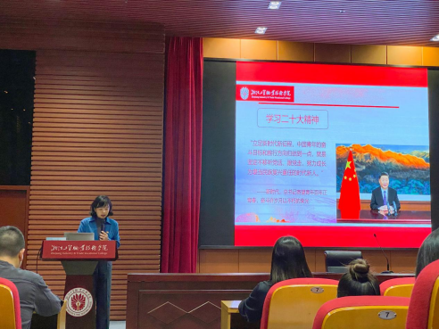 张老师在宣讲时指出,中国共产党第二十次全国代表大会,是在全党全国各族人民迈上全面建设社会主义现代化国家新征程、向第二个百年奋斗目标进军的关键时刻召开的一次十分重要的大会,是一次高举旗帜、凝聚力量、团结奋进的大会,对凝聚和激励全党全军全国各族人民高举中国特色社会主义伟大旗帜、全面建设社会主义现代化国家、全面推进中华民族伟大复兴具有十分重大的政治意义、理论意义、战略意义、实践意义。张老师说,百年大党,斗志昂扬,意气风发!习近平总书记在党的二十大报告中指出,要“坚持以文塑旅、以旅彰文,推进文化和旅游深度融合发展。”这既是对新时代以来我国旅游业发展路径、发展经验的高度总结,也是为新时代旅游业高质量发展提供了重要遵循、指明了发展方向。