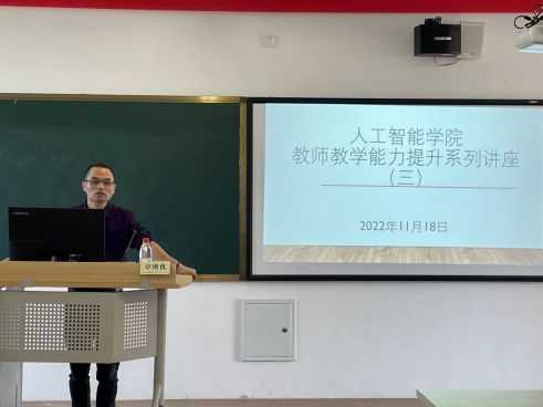 为深入贯彻落实习近平总书记关于教育的重要论述和全国教育大会精神,把思政教育贯穿人才培养体系,全面推进学院课程思政高质量建设,帮助青年教师更好地将思政教育融入课堂教学,11月18日下午在人工智能学院楼409教室开展了青年教师教学能力提升系列讲座之三。讲座由学院副院长章增优主持,特邀人文学院郭培俊教授担任主讲人,近三年入校的青年教师参加了此次讲座。