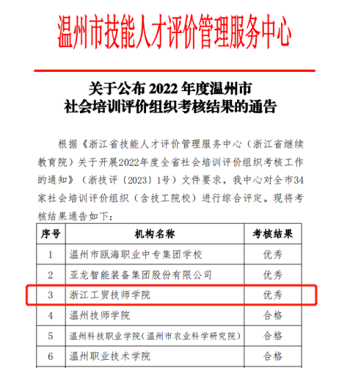 2023年2月,温州市技能人才评价管理服务中心公布了温州市社会培训评价组织考核结果,浙江工贸技师学院在34家参评的社会培训评价组织(含技工院校)中脱颖而出,被评为“2022年度温州市社会培训评价组织优秀考核单位”(全市仅有三家)。
