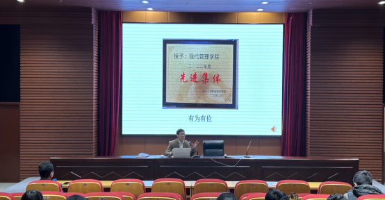 现代管理学院党总支书记项光春以“新起点 新征程 新目标 新任务”为主题作大会讲话。他指出,2022年现代管理学院各方面工作都取得新的突破,创造了新的成绩:党建双创工作取得新成效、党建思政成果取得新丰收、学生专业技能竞赛取得新突破、教育教学改革取得新进展、体教融合育人取得新业绩、社会服务品牌取得新塑造,这是全体师生共同努力的结果,可喜可贺。
