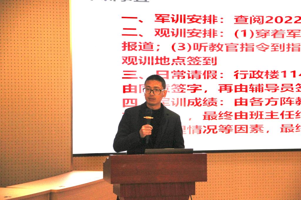 首先,季焕磊老师介绍春季学期的军训安排、军训日常请假流程和军训成绩评定方法,希望学生干部做好服务班级同学工作,助力教官圆满完成军训工作。学生公寓是大学生日常生活与学习的重要场所,推进文明寝室建设和公寓文化建设利于高校“立德树人”的育人目标。在会上,季老师带领学生干部学习学校的“星级文明寝室创建与管理办法”,希望各班级认真学习和落实文件精神,推进班级的寝室建设。紧接着,陈君老师就学生日常事务和管理、奖助学金评选工作等其他事务发表重要讲话,希望班级学生干部在工作中秉承服务理念,尽心尽责、及时有效落实各项班级工作,公平公正地开展各项事务。