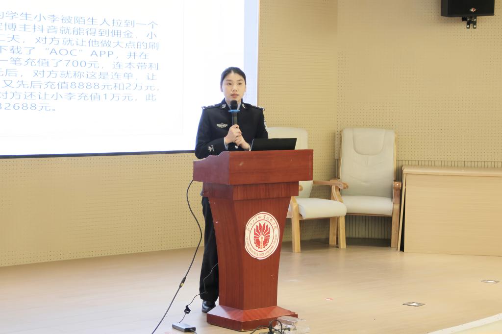 鹿城反诈中心陈乐乐警官以真实案例为切入点,重点讲解兼职刷单、杀猪盘、办理贷款、冒充公检法等诈骗案例,介绍了防范诈骗的措施和诈骗犯罪分子的惯用手段,更以一个个鲜活的数据介绍近年来大学生容易遭遇的诈骗形式和作案规律。乐乐警官也提醒同学们要增强反诈意识,掌握反诈骗方法,更要时刻谨记“刷单是幌子,骗钱才是目的”,主动远离兼职刷单类诈骗,保护自身财产安全。与此同时,鹿城区公安局反诈骗中心的警员们在现场发放反诈骗宣传手册,多渠道扩大宣传覆盖面、多方式增强宣传影响力。