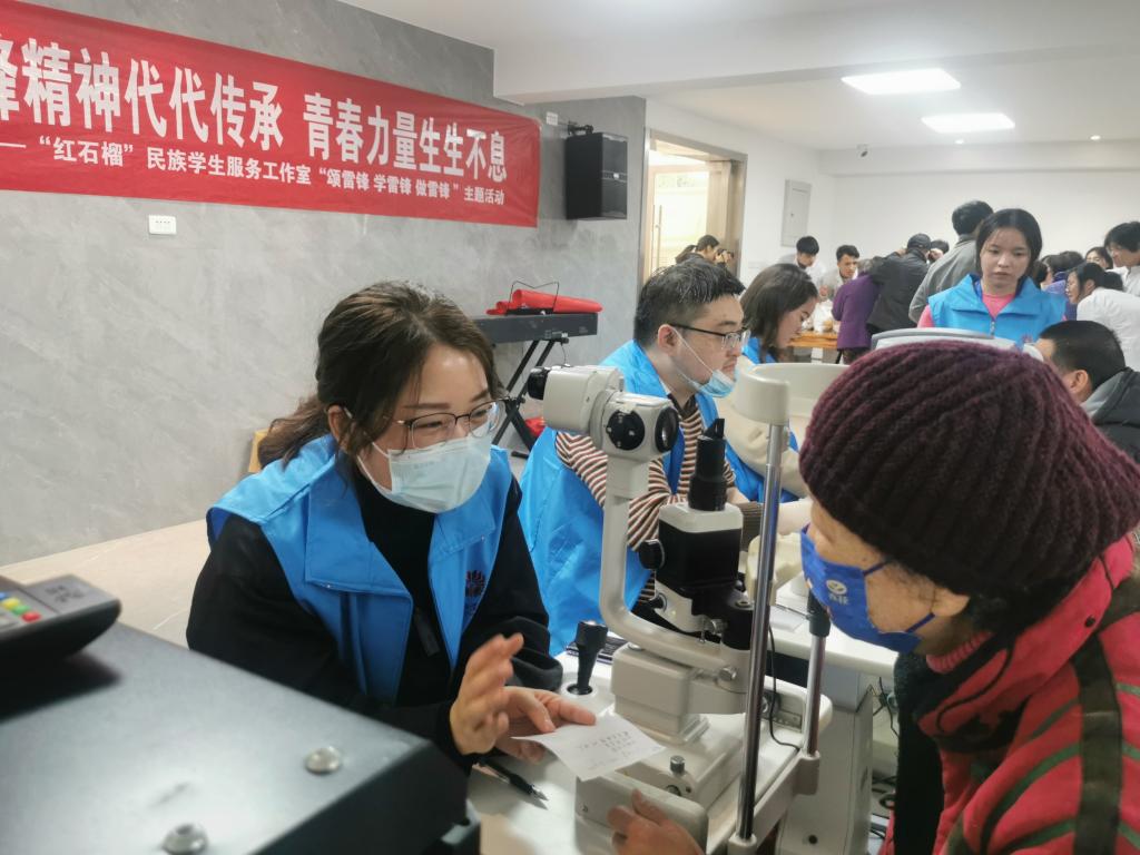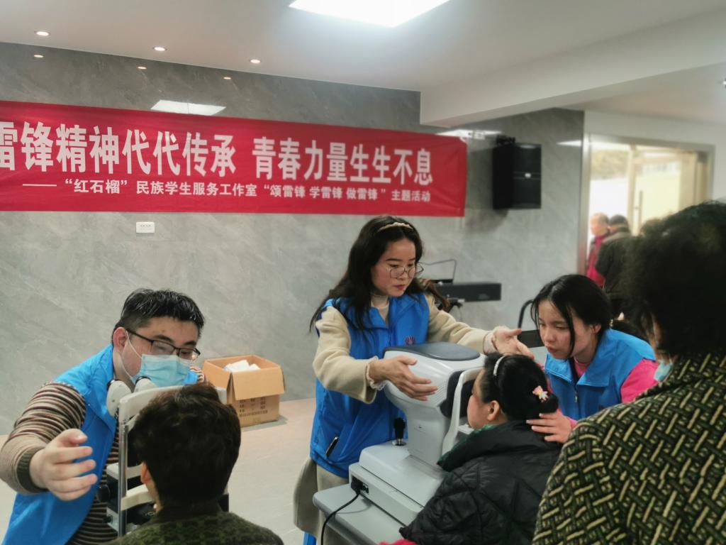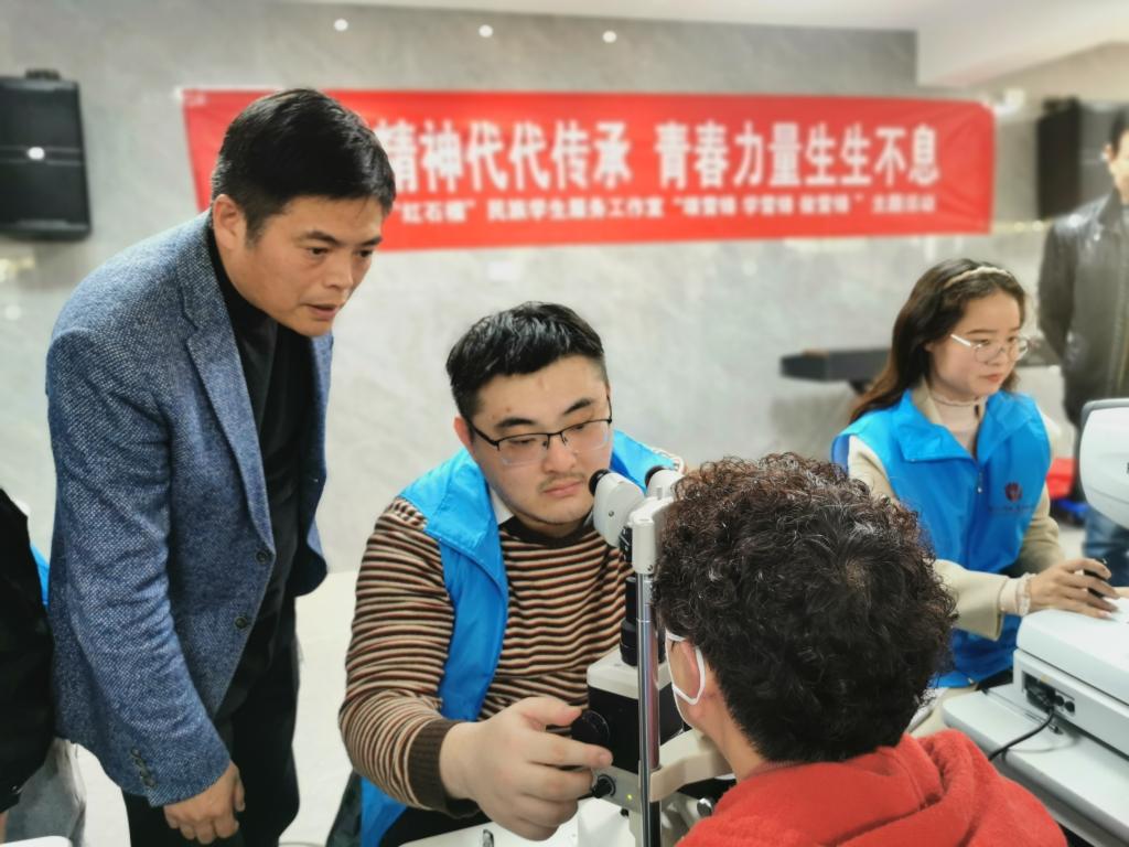 这群白衣天使来自于“红石榴’睛’彩名班主任工作室”的师生们,他们带来裂隙灯显微镜、电脑验光仪、 灯箱视力表等专业仪器,为老人们送上专业服务。“奶奶,您的白内障引发了青光眼,您需要早点就医,有可能需要安排手术呢……”工作室的教师郑奕奕耐心地为老人进行检测,对于有可能存在严重眼部疾病的老人,郑老师不忘多声叮嘱。