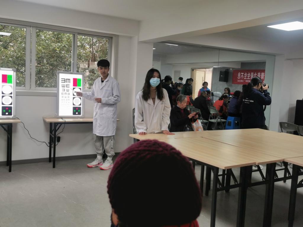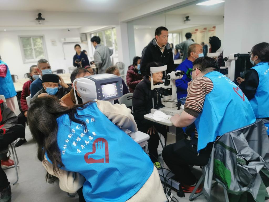 芳园社区文化礼堂内,来了一群“白衣雷锋”,他们给老人们测视力、量眼压、查瞳孔,视力检测完毕的老人,最后还能获得标准度数的老花镜,让老人们很是欢迎。