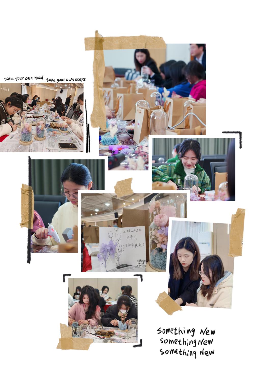在花艺师的指导下,一场以“健康、快乐、感恩,送给最美的她”为主题的DIY永生花玻璃罩手工制作活动在“女神节”前夕悄然举行。同学们从底座入手,步步增添花材,将自己的美学创意与互动交流心得融入作品之中,零碎的永生花材像被赋予了神奇的魔法,在同学们手上形成精致而富有灵气的永生花艺。