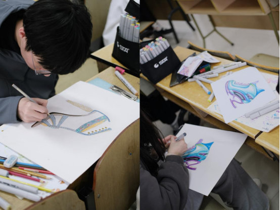 学院紧跟社会热点及时代风向,融合专业内容,设置符合专业特色的主题竞赛。其中,工业设计竞赛围绕“数智生活”主题让学生思考智能科技;鞋类设计与工艺专业学生在“无限共生”的设计命题下完成创意构思、鞋款设计、效果图技法表现等多个设计制作流程;广告艺术设计专业以“红色革命精神”为主题,在竞赛中融入思政元素,让学生重忆革命的光辉岁月……学生将信息化、智能化的创新创造,融入到自己的设计灵感中,从而创作出更具现代化特点的作品。