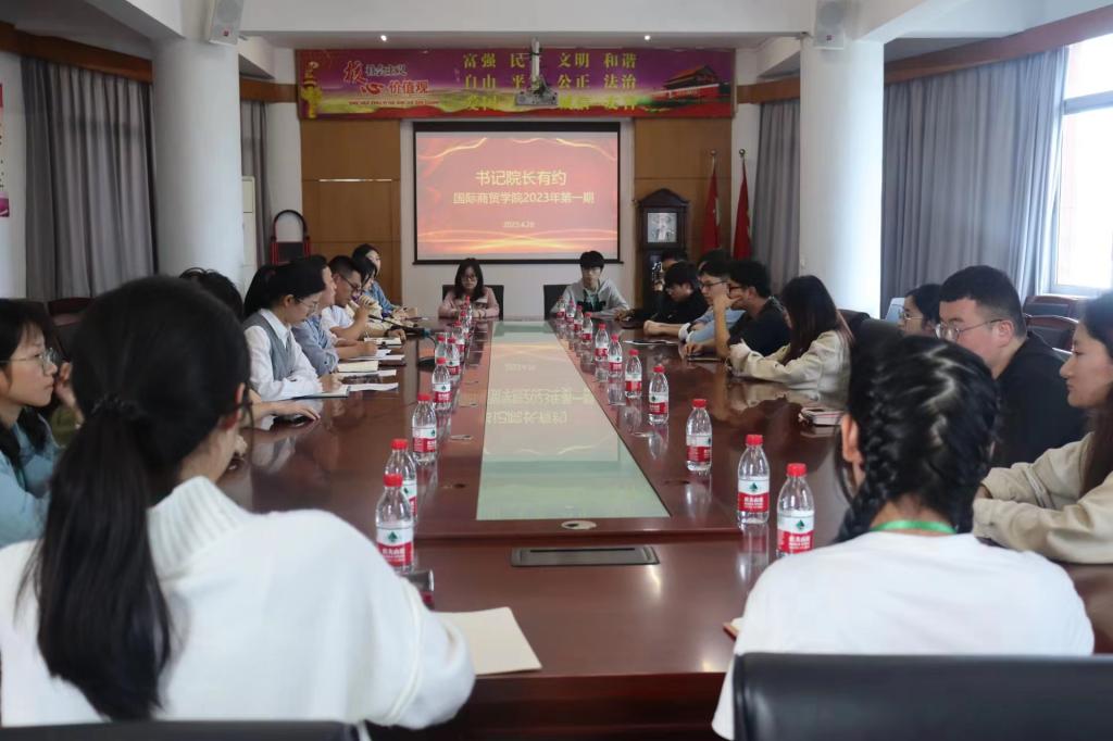 为深入学习宣传贯彻党的二十大精神,深刻领会习近平总书记关于民族团结进步的重要论述,用心用情做好少数民族同学的思政工作,帮助少数民族同学解决生活、学习、思想方面的问题和困难,4月28日下午,国际商贸学院开展2023年第1期“书记院长有约”活动,国际商贸学院党总支书记王耀贵、院长成荣芬、实训中心主任金个和组织员周妍妍与20名少数民族学生齐聚一号楼六楼会议室,举行座谈会。