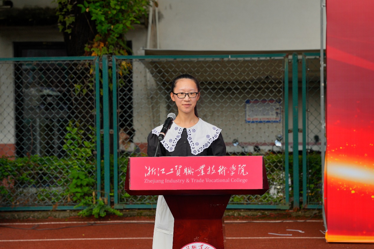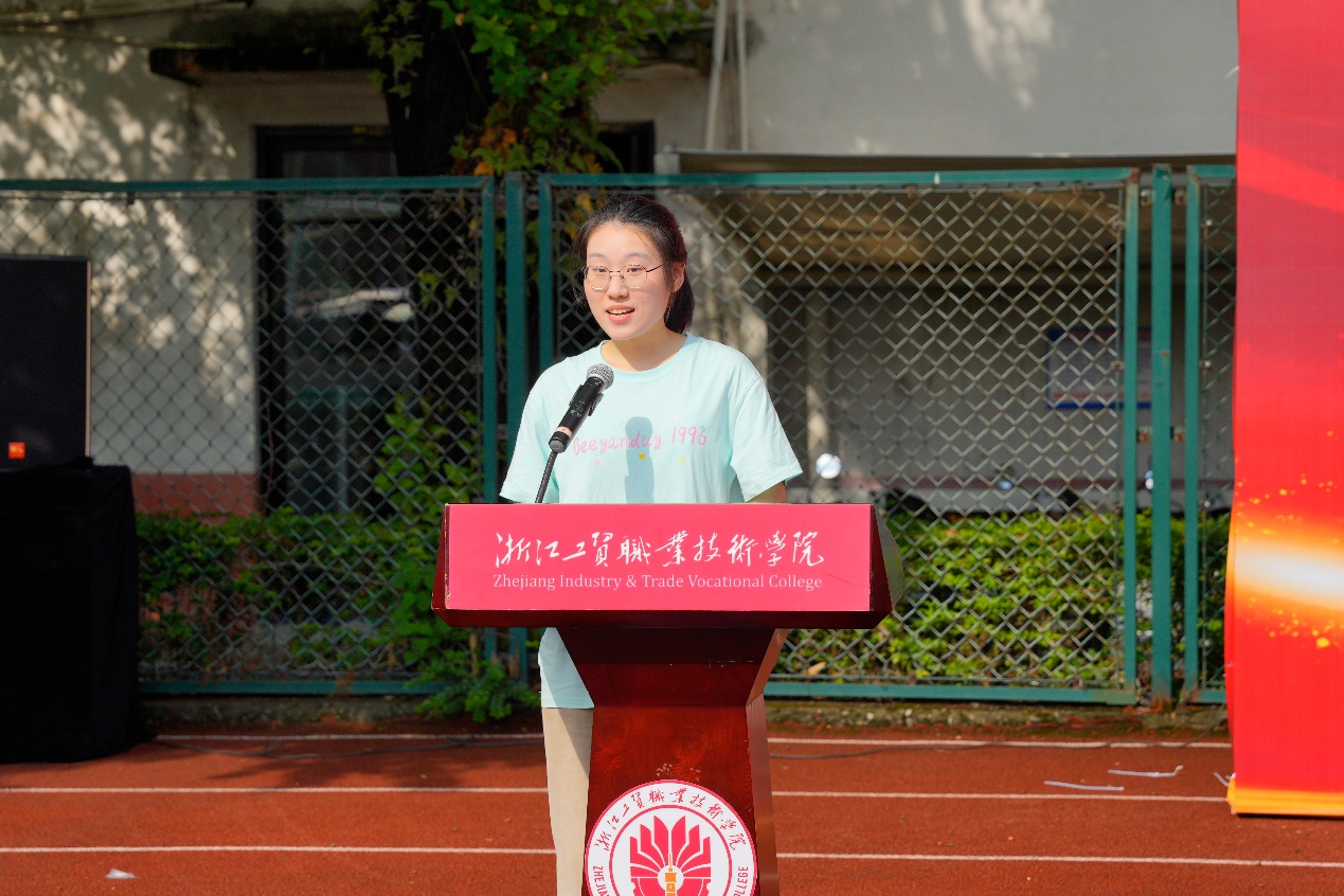 新生代表洪彩蝶发言,洪同学回顾自身高考的艰辛与收获。她的话语充满了对自主学习的重视,对投身实践的渴望,以及对成功积累的坚持,最后也表达了对未来大学生活的憧憬和期待。