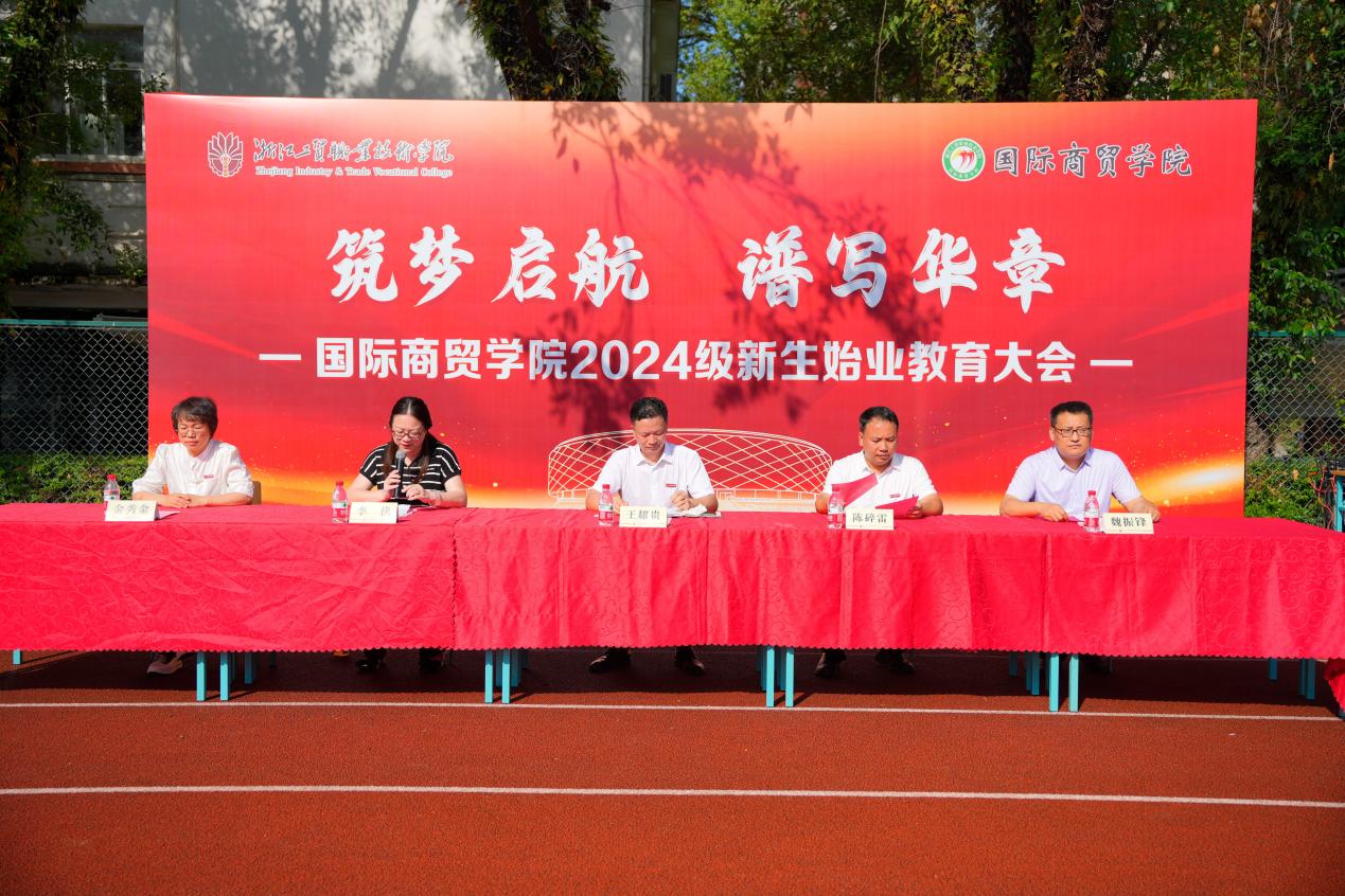 骄阳不坠青云志,磨砺使得玉初成。2024年9月20日上午8:30,国际商贸学院2024级新生始业教育大会在府东路校区操场举行。本次大会由国际商贸学院党总支副书记李侠老师主持,国际商贸学院党政领导班子、专业主任、辅导员、2024级班主任、2024级全体学生出席此次大会。