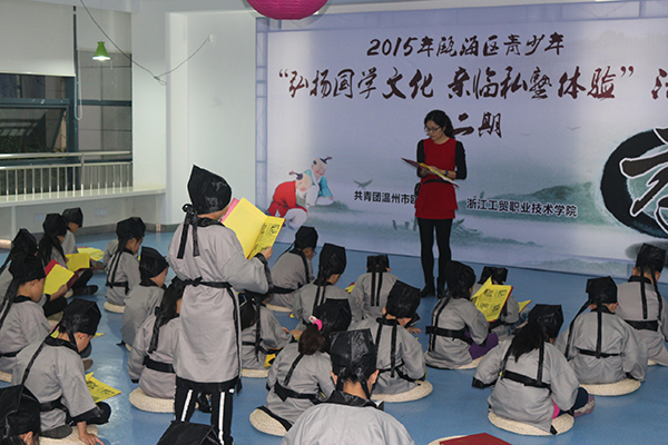 为传承国学精髓,弘扬传统文化,近日,电子系携手瓯海团区委,在瓯海区青少年活动中心举办了以“知感恩,明孝道”为主题的第二期“弘扬国学文化,亲临私塾体验”活动,百名青少年及其父母一同参加了此次活动。