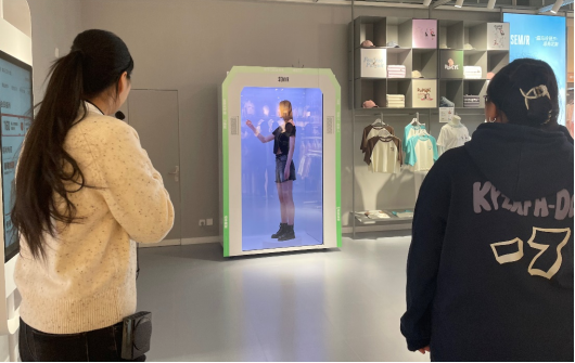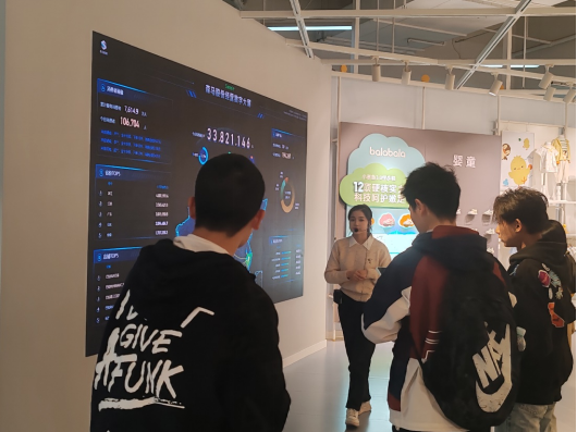 国贸专业学生则前往森马品牌展区参观。在品牌展区,国贸专业学生们悉心聆听讲解,对森马的企业文化和成就有了初步了解。在新兴技术展区,学生们对森马的科技创新成果赞不绝口,特别是数字换衣技术让他们大开眼界。让同学们印象最深刻的是森马数字大屏助力销售,森马集团利用数字大屏技术,集成企业的销售数据、库存情况、市场反馈等多维度信息,实现了销售动态的实时显示与全面掌控。