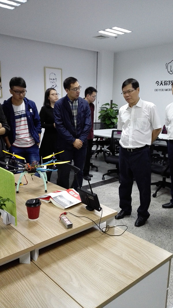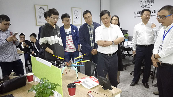 我院学生项目作为第一批入驻的大学生创新创业团队,在现场受到关注。徐立毅副书记走近大学生创业工作室时,被一台小型无人驾驶飞机所吸引,这是我院电子系李庆海老师和他带领的学生团队创造发明的。现场,李庆海老师为徐立毅市长介绍了该发明的原理、结构、用途及市场前景等。徐立毅对我院学生创新创业的举措和该产品的构思、创新表示高度赞许,并指出了其未来的发展空间。