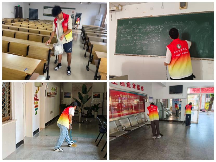 志愿者们分工有序,身影遍布校园多个区域。在六号楼教室与学生服务大厅,同学们细致擦拭黑板、清理课桌、拖扫地面、整理公共设施,以辛勤汗水守护师生日常学习与办事环境的整洁明亮。