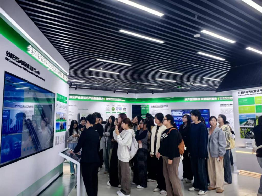 在正泰创新体验中心,讲解员为师生系统介绍了正泰的发展历程、企业文化、社会责任、企业荣誉、全球区域本土化战略等内容,其中重点介绍了正泰的智能制造工厂、低压电器生产线、智能配电物联网系统,光伏新能源全产业链布局与全场景绿色能源电站的开发建设。在现场,学生通过体验全屋智能系统和观看企业宣传视频,对正泰在绿色能源与智能制造领域的领先实践有了更加全面的认识。
