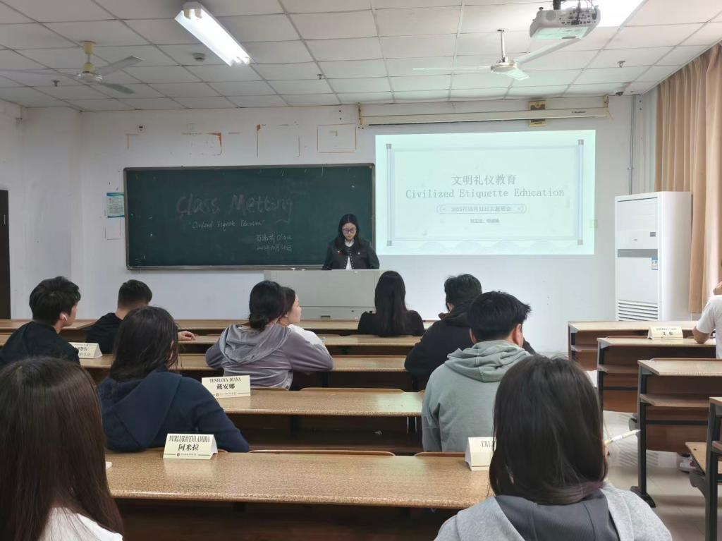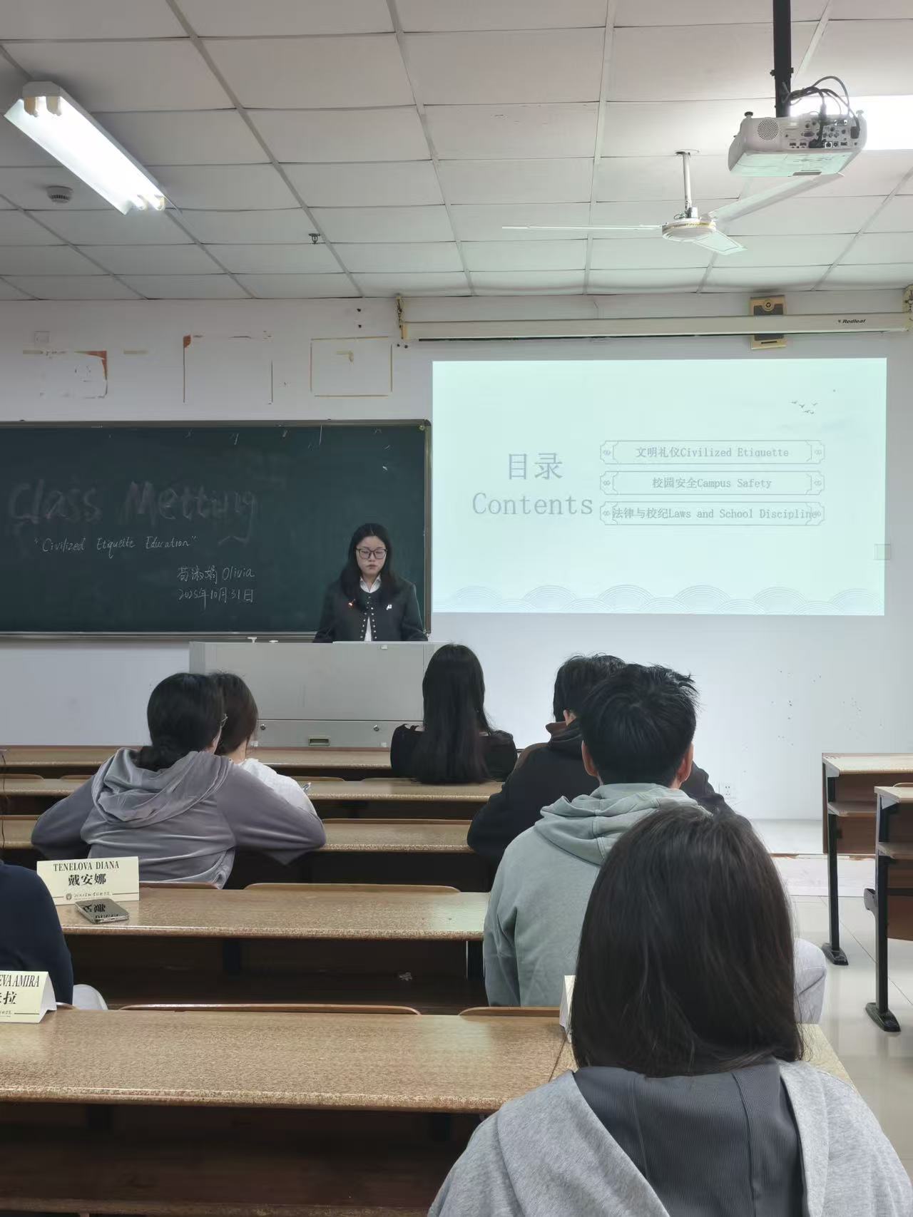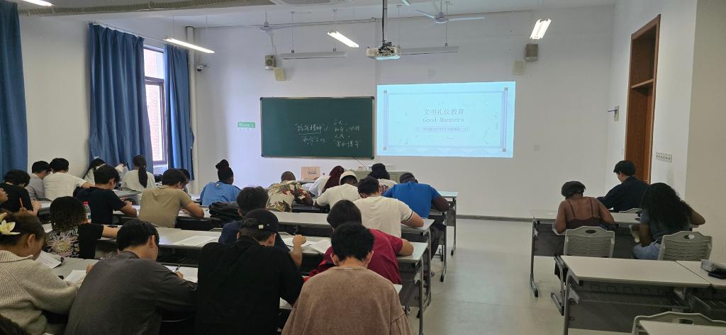 班会采用"讲解+互动"双轨模式:从课堂举手发言的"五指并拢"手势,到食堂打饭的"排队一米线";从称呼老师的"您"字用法,到公共场所"轻声交谈"的音量控制。国际教育学院的老师和志愿者,用“情景演示+互动实操”的方式,教南非、哈萨克斯坦学子学习日常礼仪:从“与人见面时的握手力度”“递接物品时双手递送”,到“食堂就餐时不插队、按需取餐”“在宿舍走廊、图书馆等校园公共区域保持安静”的行为规范,每一个细节都结合国际学生手册中的“国际学生日常规定和制度”讲解。
